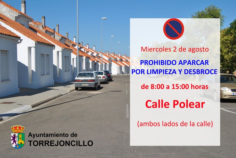 AVISO. PROHIBIDO APARCAR POR LIMPIEZA DE CALLE POLEAR 01 agosto 2023 Se prohíbe el estacionamiento de 8:00 h. a 15:00 h. del miércoles 2 de agosto, en Calle Polear, por limpieza y desbroce de la misma.